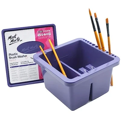 The Twin Compartment Brush Washer is an invaluable accessory for artists and provides a quick and convenient way to clean and dry your brushes. It is a practical accessory for acrylic and watercolour painting. The Plastic Twin Compartment with Lid Brush Washer features 12 holes on the rim for holding brushes upright to dry. This includes 6 different sizes. The lid can also be used as a palette. One of the compartments has a ribbed section for thorough cleaning and the other one with slanted grooves for resting brushes in water while working.