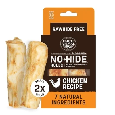 THE HEALTHY ALTERNATIVE TO RAWHIDE – Rawhide? No thanks. No-Hide sets the standard with a digestible, long-lasting dog chew. Packed with flavour and made without animal hides or any chemicals, it’s the feel-good choice for happy, healthy dogs PERFECTLY PORTIONED FOR SMALL DOGS – These No-Hide chicken dog chews are the ideal size for small pups (5–18 kg). With simple ingredients and an irresistibly chewy texture, they’re easy to digest and full of flavour MADE USING THE FINEST NATURAL INGREDIENTS – Crafted with higher welfare chicken, brown rice, olive oil and pineapple stem to aid digestion, these dog chews contain no synthetics or preservatives – just wholesome goodness baked to chewy perfection HEALTHY DENTAL CARE – No-Hide dog chews are naturally long-lasting, helping to reduce plaque and tartar buildup through healthy chewing to support strong teeth and gums – because good dental care starts with every chew IRRESISTIBLY GOOD & RESPONSIBLY MADE – As a certified B Corp, Earth Animal does things differently. Our rawhide free dog chews are made with simple, natural ingredients and 100% recyclable packaging — because wagging tails shouldn’t cost the earth