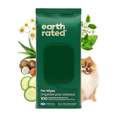 Earth Rated Hypoallergenic Dog Wipes, Cleaning and Odor Controlling Grooming Wipes for Paws, Body, Butt, Perfect Puppy Adult Dogs, White Tea & Basil Scent, 100 Count