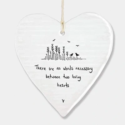 East of India Hanging Heart Gift Two Loving Hearts Is made from porcelain and is white in colour. The heart reads 'there are no words necessary for two loving hearts', in black lettering. The heart is held up by thick durable string. Measures approx. 10cm x 11cm x 1cm. Perfect for gifting to a loved one.