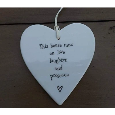 This House Runs On.. Porcelain Hanging Heart Wall. The hanging heart is made from porcelain, and is white in color. The heart reads, 'This house runs on love laughter and prosecco', in dark grey lettering. The hanging heart is held up by thick, durable string. Measures approx. 9cm x 10cm.