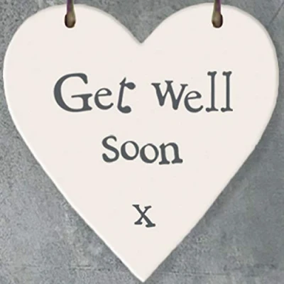 East of India Mini wooden heart on wire hanger: Get Well Soon