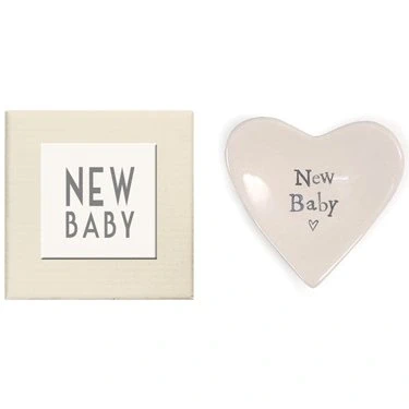 New Baby White Porcelain Heart Dish The small heart dish is white in color and has 'New Baby' written in dark grey lettering. The heart dish comes in an ivory display case. The case has a small 3D carboard design, which reads the same as the dish itself. Measures approx. 5cm x 5cm, and is made from Porcelain. Perfect for Gifting!