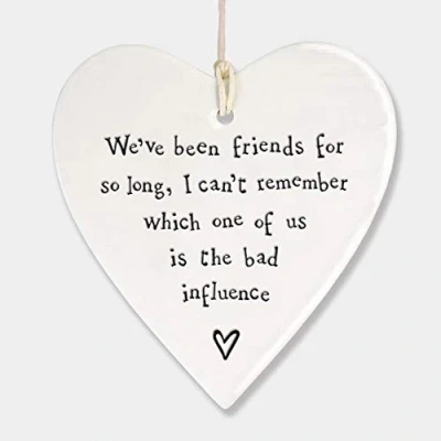 Charming Design: A heart-shaped porcelain ornament with a sweet, friendship-themed inscription, 'We've been friends for so long, I can't remember which one of us is the bad influence' Perfect Gift: Ideal for Friendship Day or Mother’s Day, this hanging heart is a thoughtful token of affection Minimalist Style: With its simple, elegant design and red color, this ornament fits seamlessly into any home decor Easy to Display: Comes with a cord or hook for easy hanging, perfect for walls or windows Durable Material: Crafted from high-quality porcelain, ensuring longevity and resistance to everyday wear and tear