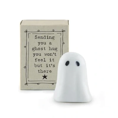 MINI MATCHBOX GIFT/DECOR - The Ghost hug Matchbox is a charming and whimsical keepsake that combines a sweet sentiment with playful design. Inside the matchbox, you'll find a delicate porcelain ghost figure. The matchbox itself is adorned with the heartwarming phrase "Sending you a ghost hug you won't feel it but its there" making it a perfect gift for someone special or a delightful addition to your Halloween or autumn décor. AUTUMNAL GIFTS - The porcelain ghost is crafted with care, featuring a friendly and endearing design that adds a touch of magic and joy to any space. The matchbox, with its heartwarming message, is perfect for gifting to friends, enhancing your seasonal decorations, or simply enjoying as a charming token of friendship that brings warmth and cheer to the spooky season and beyond. MEASUREMENTS - 3.4 x 2 x 4.5 MINI MIX AND MATCH - See our matching decorations to complete the look for your celebrations! SHARE WITH US - Tag us at @luckandluckshop with your creation. We love to see our products in use.