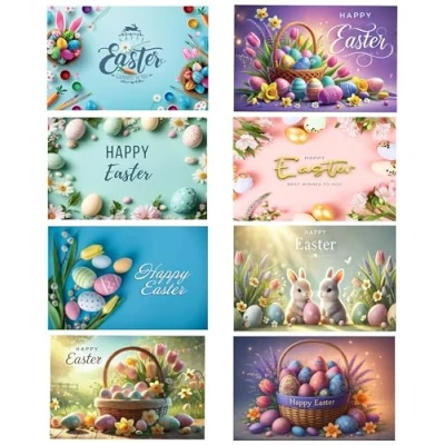 Easter cards multipack pack contains 8 cards (8 designs x 1 of each). 14.8x10.5 cm Cards is supplied folded with matching envelopes Our greeting cards are made from good quality card paper, safe and durable, thick and smooth. , it is proper size, can fully accommodate your blessings, easy to carry and use Easter retro postcards are designed in Easter theme, printed with Easter eggs, flowers,Easter bunnies and so on Their printing looks clear, can support you to write, which adds to the festive atmosphere, and bring you good mood Made in UK – Designed, printed and packed in the UK, our cards and packaging are made from board which is also manufactured in the UK We only use card and envelopes which are fully recyclable.Environmentally Friendly Cards Made from sustainably sourced paper