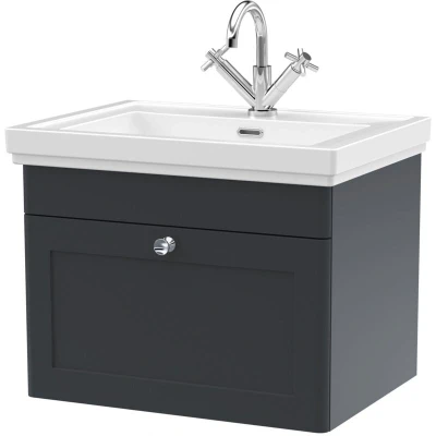 What's Included:Eastlake Malvern Wall Hung Bathroom Vanity Unit - Soft Black 600mmSingle Tap Hole BasinTap, waste and fixings sold separatelySpruce up your bathroom with a brand new vanity unit. This Eastlake Malvern Wall Hung Bathroom Vanity Unit has everything you need, including storage space, a soft close drawer, and a large basin with a tap hole. It also looks fantastic - what's not to love?The unit comes in a beautiful soft black finish, drawing inspiration from classic vanity unit designs to create the perfect vanity unit. Indeed, it's a fantastic match for modern and traditional bathrooms, creating a refreshed and clean look no matter where it is. There's also a large drawer which provides an abundance of space for all of your bathroom accessories and toiletries.On top of the unit, you'll find a luxurious, white sink, which is durable and stylish. While the sink has a pre-drilled tap hole, it doesn't come with a mixer tap, silicone, or a waste. But don't you worry - you can find mixer taps in our collection, and silicone and a waste can be added at checkout!