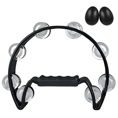 EastRock Tambourines for adults, Half Moon Hand Tambourine, Double Cutaway Tambourine with 16 Jingles, Row Metal Held Musicians Bands(16 Black)