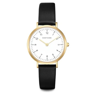 AmazonSTILVOLLE DAMENUHR: Das Modell des Uhrenlabels Eastside verbindet urbanen Charme mit edlen Materialien und zeitloser Uhrmacherkunst HOCHWERTIG: Metallgehäuse (32,1 mm) mit Gelbgold-Ionenplattierung, geschraubtem Edelstahlboden, weißem Zifferblatt, Strichindices, arabischen Ziffern und Stabzeigern FLEXIBEL: Das glatte, schwarze Echtleder-Armband wird mit einer Dornschließe angepasst (Armbandlänge 19,5 cm) PERFEKT GESCHÜTZT: Die Uhr ist spritzwassergeschützt (3 ATM) und mit einem hochwertigen Mineralglas versehen RUNDUM SORGLOS: Lieferung in einer attraktiven Geschenkbox und inklusive Bedienungsanleitung