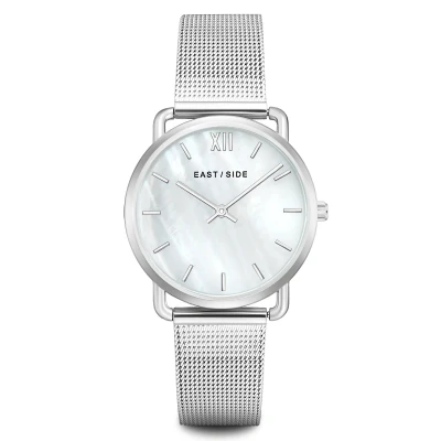 AmazonSTYLISH WOMEN'S WATCH: This Eastside model is a perfect symbiosis of timeless design and first-class quality HIGH QUALITY: Case with screwed stainless steel back (diameter 33 mm), white mother-of-pearl dial with line indices and baton hands FLEXIBLE: The Milanaise stainless steel strap is fitted to the wrist with a sliding closure and is suitable for an arm circumference of up to 21 cm PERFECTLY VALUED: The watch is splash-proof (3 ATM) and equipped with a scratch-resistant, hardened mineral glass CAREFREE ALL AROUND: Supplied in an attractive case and including operating instructions