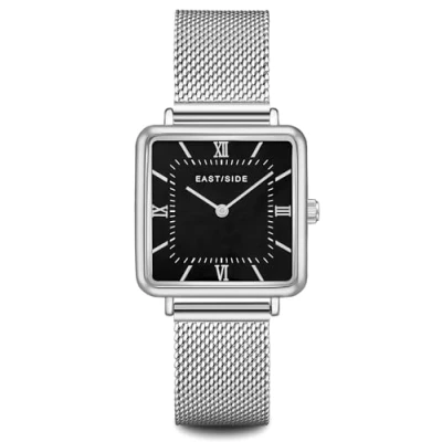 AmazonSTILVOLLE DAMENUHR: Das Modell des Uhrenlabels Eastside verbindet urbanen Charme mit edlen Materialien und zeitloser Uhrmacherkunst HOCHWERTIG: Eckiges Metallgehäuse (29 x 28,9 mm) mit geschraubtem Edelstahlboden, schwarzem Zifferblatt, Strichindices, römischen Ziffern und Obélisque-Zeigern FLEXIBEL: Das filigrane Milanaise-Armband aus Edelstahl wird mit einem Schiebeverschluss angepasst (Armbandlänge 20 cm) PERFEKT GESCHÜTZT: Die Uhr ist spritzwassergeschützt (3 ATM) und mit einem hochwertigen Mineralglas versehen RUNDUM SORGLOS: Lieferung in einer attraktiven Geschenkbox und inklusive Bedienungsanleitung
