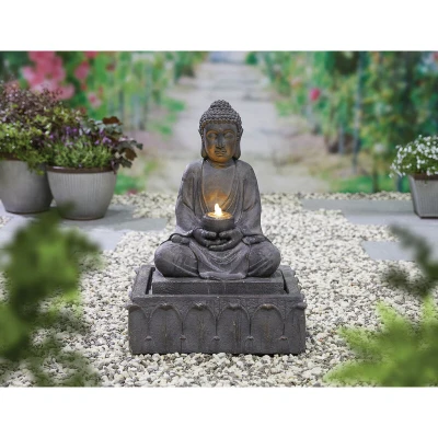 General description Serene and tranquil, this Easy Fountain Serenity LED Distinctive Garden Water Feature brings a sense of calm to any outdoor space. Depicting a meditating Buddha, the Serenity fountain creates a stunning focal point with peaceful trickling waters. It is also complete with an LED light that provides an elegant glow, day or night. Technical specifications Self-contained fountain Recirculating pump included Durable construction with a high-end stone effect 50% lighter than real stone Low voltage LED light included Installation Plug and play - no electrical or water plumbing required Simply fill up, plug in, and go All fittings and instructions are included Usage Easy to set up Low maintenance