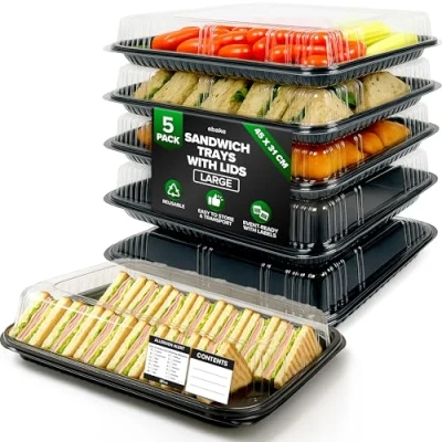 REUSABLE - Our Sandwich Trays and Lids are made out of recycled plastic and can be hand washed with warm soap and water! Using dish soap and a sponge you can wash and leave to dry to use again. ALLERGY STICKERS INCLUDED - Our Buffet Trays with Lids set comes with customizable stickers to write the "contents" and "allergies" of the food you put in the trays. The trays come with tight fitted clear lids to seal your food and showcase what is in the trays! CATERING TRAYS - Events, parties, banquets, weddings, birthdays, catering and home cooking, these buffet trays can be used at all events or any occasions. You can use them for sandwiches, sushi or bagels for picnics, putting it into the fridge or using them for a buffet. AVAILABLE IN VARIOUS SIZES & PACKS – Select the perfect size and quantity for your needs. Choose from tray sizes of 34 × 24 × 7.5 cm, 39 × 29 × 7.5 cm, or 45 × 31 × 7.5 cm, with multiple pack options ideal for everything from intimate gatherings to large-scale events. WARRANTY - If you do have an issue with the product, message us (the seller) directly for a 6 month warranty on this product.