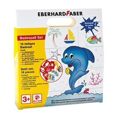 Eberhard Faber 524116 Bath Fun Box 16 Piece Set for Children with 3 Colours, 2 Crinkle Baths, 1 Sponge, 5 Chalks and Motif Stencils, Washable Painting