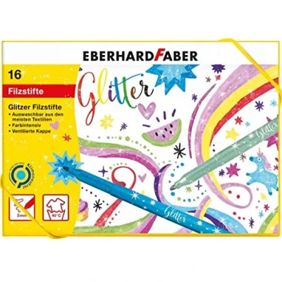 16 felt tip pens with glitter in a practical cardboard case with sturdy, impression-proof tips (approx. 3 mm) and ventilated caps to protect against drying out Intense colours for beautiful glittering highlights and a variety of creative projects Odourless, harmless water-based ink, washable from most textiles For individual gifts full of imagination - also suitable for decorating posters, photo albums, gift tags, greeting cards, diaries or scrapbooking Creative painting, drawing and craft fun for small and large artists in kindergarten, preschool, school and leisure, Manufacturer: Eberhard Faber