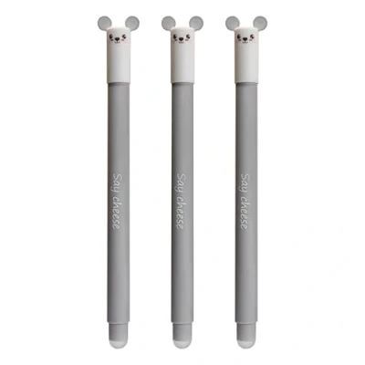 Erasable rollerball: the pen set Animal Erase it! Includes 3 gel pens with blue erasable ink. Ideal for school, college and office PRECISE WRITING With the 0.7mm line width and smooth ink flow, these erasable gel pens allow clean and precise lines Easy to correct: thanks to the plastic tips on the housing and cap end, writing can be removed quickly and cleanly due to generated friction heat - ideal for error-free work Stylish design: with the cute mouse motif and the saying "Say cheese", this gel ballpoint pen is a highlight in school supplies or office supplies REFILLABLE AND DURABLE This rollerball pen is refillable and features replaceable refills, which ensures long-term use and sustainability