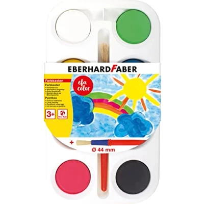 Paint box with 8 paint tablets and a brush Lid serves as a mixing palette Good coverage with high colour intensity Sticks to many different surfaces, can be mixed with each other Particularly shatterproof, ideal for use in kindergarten, preschool and school