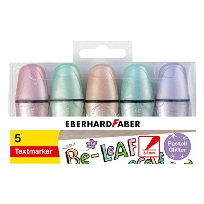 Set of 5 mini highlighters in bright pastel colours with glitter effect after drying Plastic case with 5 colours: lavender, sky blue, mint, peach and light pink Chisel tip with a line width of 2 - 5 mm for precise highlighting of text areas or flat marking of sentences Practical size, fits perfectly in the pencil case for school and in small pockets for on the go Ideal for bullet journaling, framing, colourful design, creative work and colouring