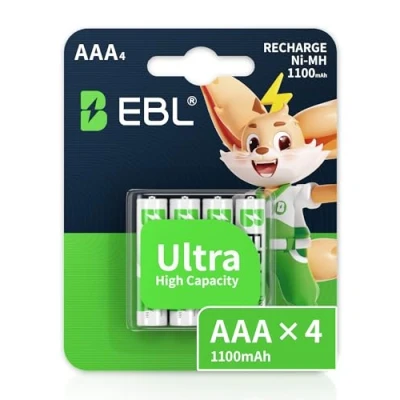 EBL 4 Pack AAA 1.2V 1100mAh Ni-MH rechargeable batteries with retailed blister pack, great for retail purpose Batteries can be recharged up to 1200 times when fully or partially drained Advanced low self-discharge technology: batteries keep approximately 80% capacity when not in use for even 3 years. Wide compatibility: ideal for a great variety of household electrical appliances, such as diverse electronic toys, solar garden light, remote controls, PDA, flashlights, alarm clocks, shavers, audio players and so forth The Ni-MH batteries made from environmental friendly materials feature in high durability Please charge fully before use, as we only charge the battery to 20% for shipping safety purpose. Batteries will reach top performance after 3-5 time fully charge cycle.