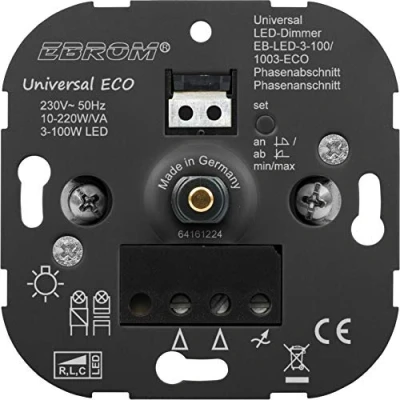 EBROM flush-mounted LED dimmer universal ECO 1003 phase control and phase control dimmer, rotary dimmer, suitable for Busch Jäer, Gira, Jung and Berker and much more. (Adaptor with instructions included) From 3 to 100 watts (e.g. also several 3.5 watt LEDs in one lamp) as well as for incandescent lamps, HV and LV halogen lamps with electronic transformer from 10 to 220 W/VA completely silent working, no buzzing or buzzing, dimensions: 71 x 71 x 33 mm, 230 V, 50 Hz rated voltage. Important: please check before purchase whether your bulbs and/or train and/or train can be dimmed. We recommend these bulbs from well-known manufacturers Extremely high compatibility of over 99 percent of all dimmable bulbs available on the market From EBROM - Made in Germany - 5 years manufacturer's conditions see warning and disclaimer notes as well as § 477 BGB International products have separate terms, are sold from abroad and may differ from local products, including fit, age ratings, and language of product, labeling or instructions., Manufacturer: EBROM