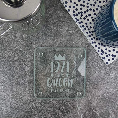 eBuyGB Drinks Mat, Placemat Engraved Square Coaster 1971 This Queen was Born Design 50th Women, Her Fiftieth Birthday Gift for Mum, Glass