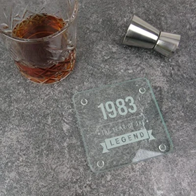eBuyGB Engraved Square Glass Coaster 1983 Year of The Legend Design 40th Birthday Gifts for Him, Men Gift Dad, Son, Brother, Uncle, Friend Drinks Mat, Placemat