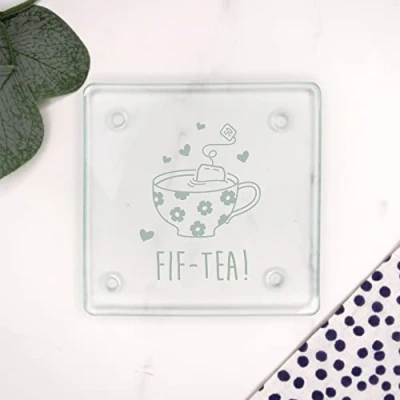 Is there a women in your life who is about to hit 50? Want to celebrate in style? Then this engraved Square Glass Coaster is the perfect gift for her! Engraved with a striking "FIF-TEA" design, one of these 50th birthday gifts is sure to put a smile on your Mum's or Grandma's face! This truly is a thoughtful Fiftieth present that can be used again and again. Our engraved Coaster makes the perfect gift for your Mum, Wife, Sister, Aunty for their birthday or Christmas this year, show them how legendary they are with this distinctive design. We are sure that this unique Coaster will get plenty of use, to indulge in some of her favourite alcohol! Our 50th birthday gifts are perfect for anyone looking for functional 50th presents, perfectly paired with a bottle of her favourite drink, we are sure it will go down a treat! This Square Glass Coaster is part of a range of 50th Birthday gifts, by where the design, "FIF-TEA" can be engraved on the following products; Neon Pink Mug, Silver Metallic Mug, Black Reveal Mug, Square Slate Coaster, Heart Slate Coaster, Bamboo Travel Flask, Gold Metallic Mug, Flexible Sofa Tray and Tea & Biscuit Board. Why not treat your loved one to a special Fiftieth gift that they will love! Dimensions: 10 x 0.5 x 10 cm