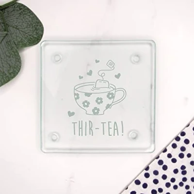 eBuyGB Engraved Square Glass Coaster THIR Tea Design 30th Birthday Gifts for Women, Her Thirtieth Gift Mum, Friend, Sister, Auntie Drinks Mat