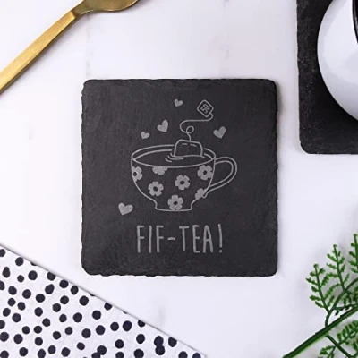eBuyGB Engraved Square Slate Coaster FIF Tea Design 50th Birthday Gifts for Women, Her Fiftieth Gift Mum, Friend, Sister, Grandma Drinks Mat