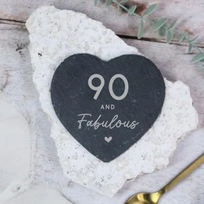 If a loved one is hitting a milestone birthday and turning 90 this year, our personalised Heart Slate Coaster is the perfect gift for her! Beautifully and professionally engraved with the words “90 and Fabulous”, our 90th birthday coaster is a keepsake gift that will remind them of the love they received on their big birthday. But the benefits of our Heart Slate Coaster go beyond its aesthetic appeal. These coasters are not only functional but also protect your surfaces from unwanted stains and scratches. They are the perfect addition to any home décor, seamlessly blending in with any style or theme. Whether it's for your sister, wife or friend, or any 90-year-old woman in your life, this coaster is the perfect way to celebrate and make them feel truly special. Our 90th birthday gifts are perfect for anyone looking for functional present, perfectly paired with one of our “90 and Fabulous” coffee mugs, we are sure it will go down a treat!