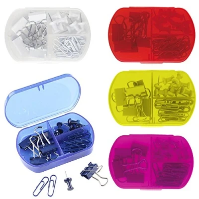 Mini stationary organizer box with stationary Stationary included: bulldog clips, paper clips and push pins Perfect accessory for school, office, home and business Comes complete in a plastic compartment pouch for easy storage and access Dimensions: 9.5 x 6 x 2 cm