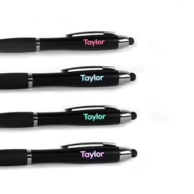 ✅ MULTIFUNCTIONAL: This light up LED ballpoint pen is well constructed using high-quality plastic that is guaranteed to be durable and sturdy yet is still lightweight, with a twist action mechanism, touchscreen stylus tip, blue ink and a stylish matte black pointer ✅ SPECIAL FEATURE: Make your logo, brand or text pop! This pen is lighted inside with a wide range of colour lights, a solid finishing body in black and matching colour touchscreen stylus topper - ❗ PLEASE NOTE ❗ Our image for the Multicolour pen illustrates the 4 colours that will be flashing, when the pen light is activated ✅ PERSONALISED: Laser engraved with up to 20 characters including spaces, customise with any name or text, making your name or brand to be properly illuminated with the colour of the light most suitable for it ✅ CUSTOMISE: Click on the "Customize Now" button to add your engraving requirements. Please ensure you check your spelling as we copy paste your message exactly as it is written. PLEASE NOTE: The engraving preview is just a guide we may resize your text to make it the best suitable for the item DIMENSIONS (in) Length: 6 " Diameter: 1 "