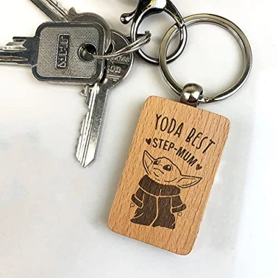 This perfect personalised Star Wars themed Keyring will no doubt create a big smile. A cute surprise for Birthday's, Anniversaries, Father's Day, Mother's Day, Christmas or any special occasions. Our Wooden Keyring is engraved with "Yoda Best Step-Mum", two star illustrations and a cute Baby Yoda. A perfect keepsake for those star wars lovers out there. Manufactured from solid, high quality, environmentally friendly Beech Wood Dimensions: 8.5 x 3 x 0.5 cm