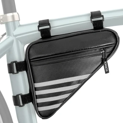 PRACTICAL BIKE BAG: Store everything that's important for the bike ride in this frame bag. Leave unnecessary luggage behind. The bag offers space for your valuables, bike lock, repair kit, ID, and phone. WATERPROOF MATERIAL: The triangle frame bag is made of water-repellent polyurethane. Its contents are protected from moisture. You can use the bag in any weather. EASY TO ATTACH: The bicycle frame bag features four fasteners. You can use these to easily attach the bag to your bike frame. WITH A ZIP: The contents of the bag are easily accessible thanks to the zip. The bag consists of a large main compartment and a small side compartment on one side and a small compartment on the other side. SAFETY THANKS TO REFLECTORS: The Frame Bag offers you more safety in twilight or darkness in road traffic. It has highly reflective strips on both sides, which reduces the risk of accidents and at the same time the triangular pocket ensures high visibility.