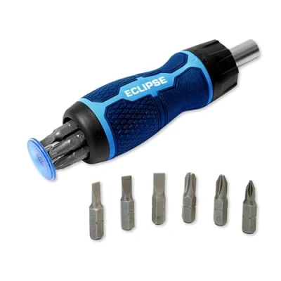 Smooth ratchet-action mechanism allows forward, reverse, and locking positions for easy screw tightening and loosening Ergonomic plastic handle provides comfort and reduces hand strain during extended use Convenient in-handle storage securely holds six screwdriver bits for easy access and portability Compact and versatile, perfect for both professional tradespeople and DIY enthusiasts Ideal for a wide range of applications including household, workshop, and general maintenance tasks 3 x Phillips Screw Bits: PH1, PH2, PH3 and 3 x Slotted Screw Bits: 4mm, 5mm, 6mm, Weight: 0.3527396192 pounds, Manufacturer: Eclipse Professional Tools