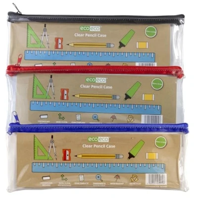Clear exam pencil case available in 3 colours. Pack of 3, 1 of each colour per pack. Water resistant and durable. Idea for school home and office. Fits 30cm ruler. Clear smooth transparent finish Responsibly sourced materials and responsibly produced. Made from 50% recycled materials, product and packaging both 100% recyclable