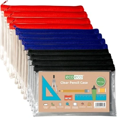 Clear exam pencil case available in 3 colours. Pack of 12, 4 of each colour per pack. Water resistant and durable. Idea for school home and office. Clear smooth transparent finish Responsibly sourced materials and responsibly produced. Made from 90% recycled materials, product and packaging both 100% recyclable