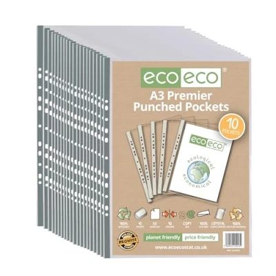 Strong 90 micron strength wallets, ideal for home, office and professional use These pockets securely hold A3 documents. 10 pockets per single pack. 20 packs of 10, 200 wallets total. Glass clear visibility with smooth finish and superior strength. Reinforced (grey) multi-punched spine for universal filing Acid free and copy safe. Responsibly sourced materials and responsibly produced Made from 100% recycled materials, product and packaging both 100% recyclable