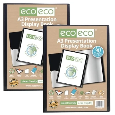 eco A3 Size 50% Recycled 40 Pocket Black Presentation Display Book, Storage Case Portfolio Art Folder with Plastic Sleeves, Pack of 2 Folders, eco006x2