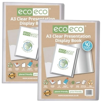 eco A3 Size 50% Recycled 40 Pocket Clear Presentation Display Book, Storage Case Portfolio Art Folder with Plastic Sleeves, Pack of 2 Folders, eco101