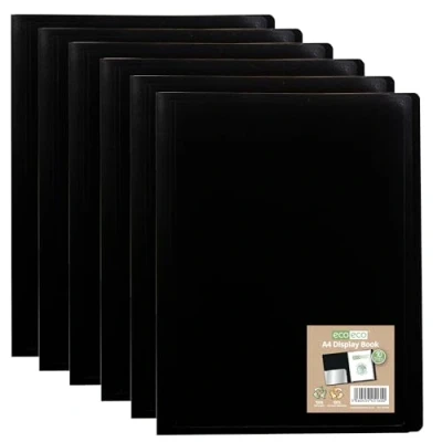 Pack of 6 Strong and flexible black 400 micron cover display book, ideal for home, office and professional use Clear additional storage pocket featured inside of front cover to house loose items and documents A total of 10 pages (20 sides to view) securely bound for optimum and multi-purpose filing 40 micron pages are acid free, smooth, glass clear and copy safe. These pages securely hold A4 documents Made from 100% recycled materials, product and packaging both 100% recyclable