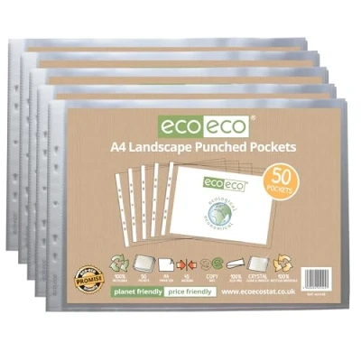 5 Packs of strong 45 micron strength wallets, ideal for home, office and professional use These pockets securely hold A4 landscape documents. 50 pockets per single pack Glass clear visibility with smooth finish. Acid free and copy safe. Responsibly sourced materials and responsibly produced Made from 100% recycled materials, product and packaging both 100% recyclable