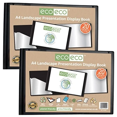 eco A4 50% Recycled 20 Pocket Black Landscape Presentation Display Book, Storage Case Portfolio Art Folder with Plastic Sleeves, (Pack of 2), eco095x2