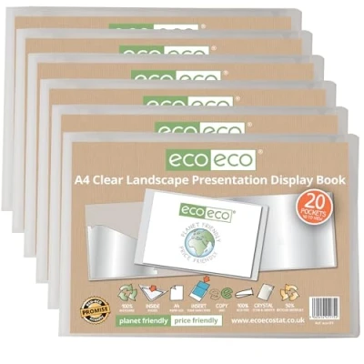 eco A4 50% Recycled 20 Pocket Clear Landscape Presentation Display Book, Storage Case Portfolio Art Folder with Plastic Sleeves, Pack of 6, eco175x6