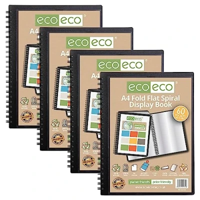 eco A4 50% Recycled 60 Pocket Fold Flat Spiral Bound Display Book, Pack of 4, eco135x4