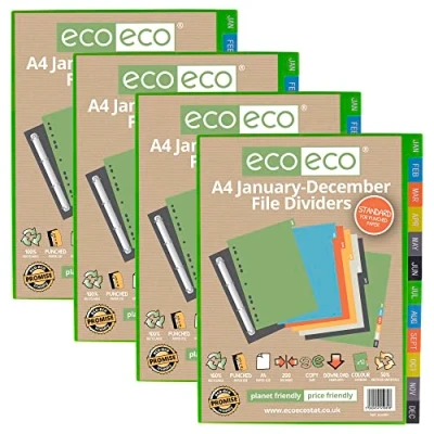 A4 size index file dividers, ideal for home, office and professional use. Pack of 4 Set of 12 dividers colour coded and labelled January - December Standard for use with punched paper Made from 50% recycled materials Responsibly sourced materials and responsibly produced
