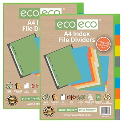 Pack of 2 (10 part) Strong 200 micron strength A4 size file dividers, ideal for home, office and professional use Set of 10 dividers colour coded for the filing and organising of paperwork and documents in ring binders and files Standard width Responsibly sourced materials and responsibly produced Made from 50% recycled materials, product and packaging both 100% recyclable