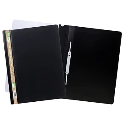 Strong black 350 micron cover A4 file, ideal for project and reports. Front clear 180 micron cover 2 pronged mechanism Securely holds up to 25 sheets of punched A4 paper (80gsm) Removeable spine presentation card for personalisation Responsibly sourced materials and responsibly produced. Made from 50% recycled materials, product and packaging both 100% recyclable