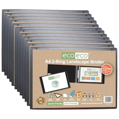 eco A4 95% Recycled Presentation 22mm Spine 2 Ring Landscape Binder Black, Pack of 12, ec0146x12