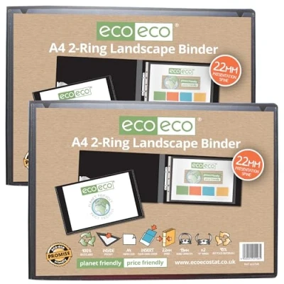 eco A4 95% Recycled Presentation 22mm Spine 2 Ring Landscape Binder Black, Pack of 2, ec0146x2